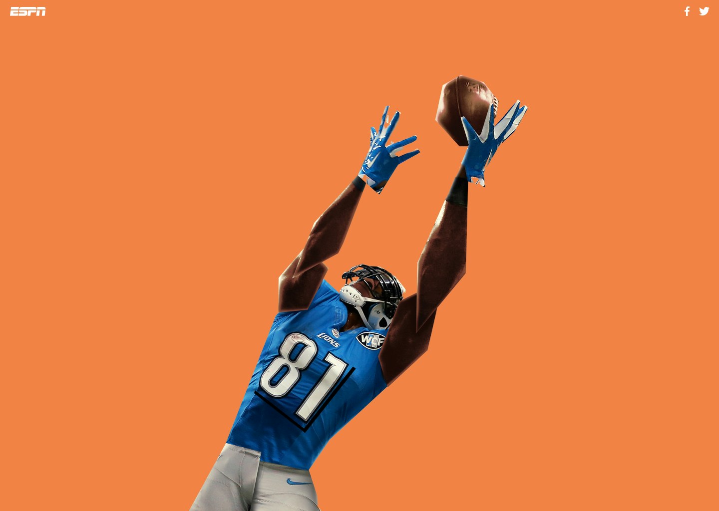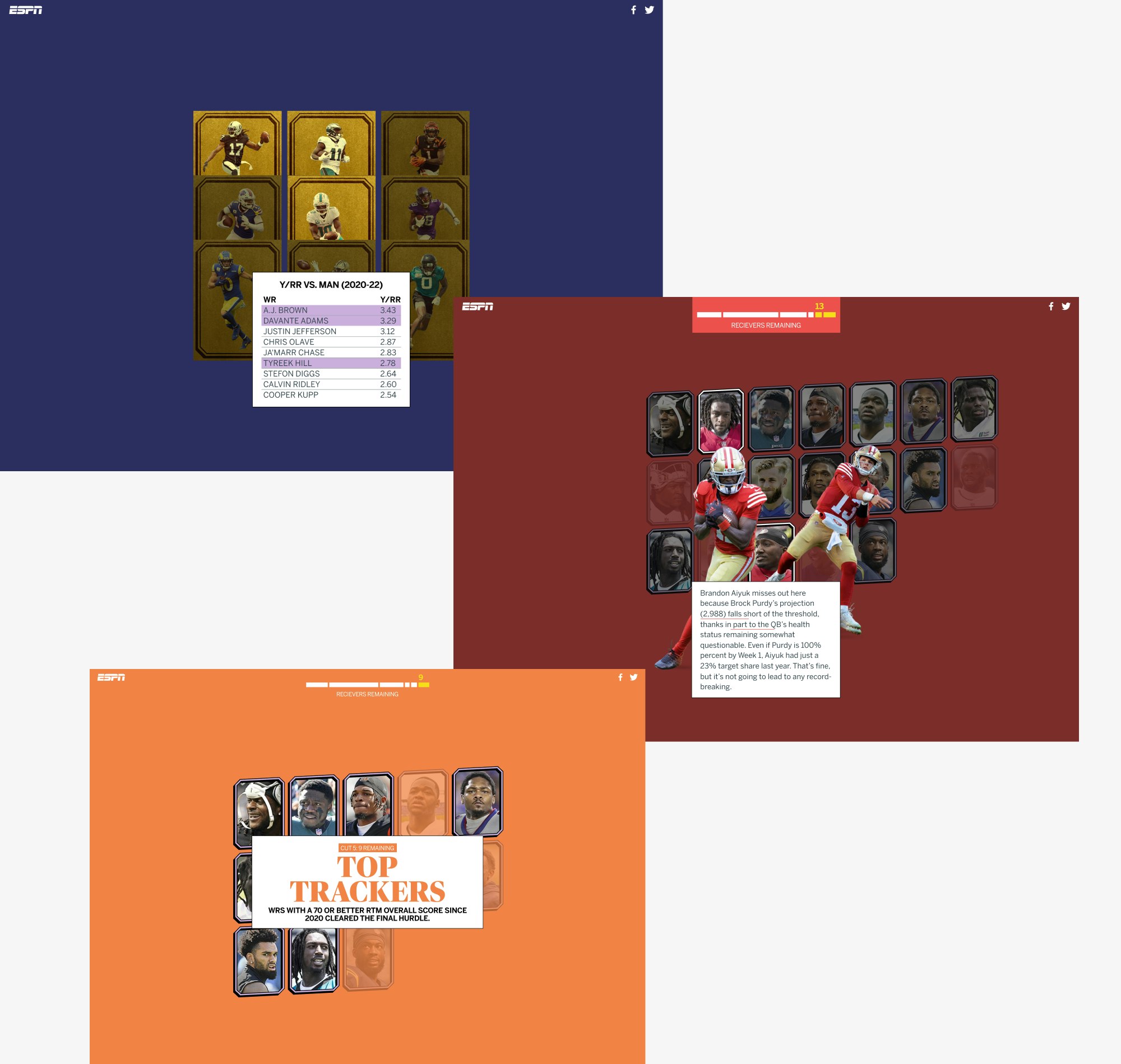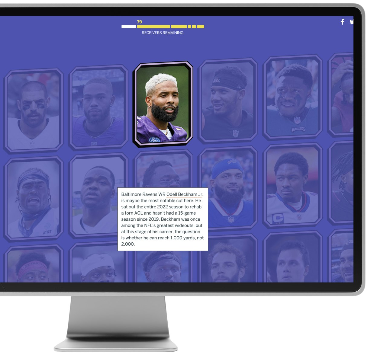 But how do we bring that larger-than-life player into the browser, and tell the story of almost 100 receivers and their chances to break this decade-long record? Well, it takes some clever design, brilliant copy, and a lot of exciting-to-scroll scrolling that takes your from cut to cut, as we dwindle down to a list of 9 absolute beasts.