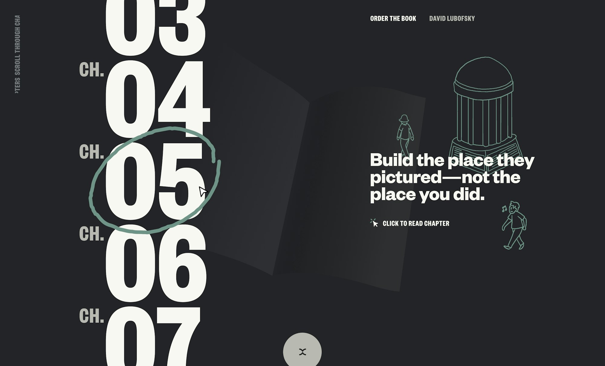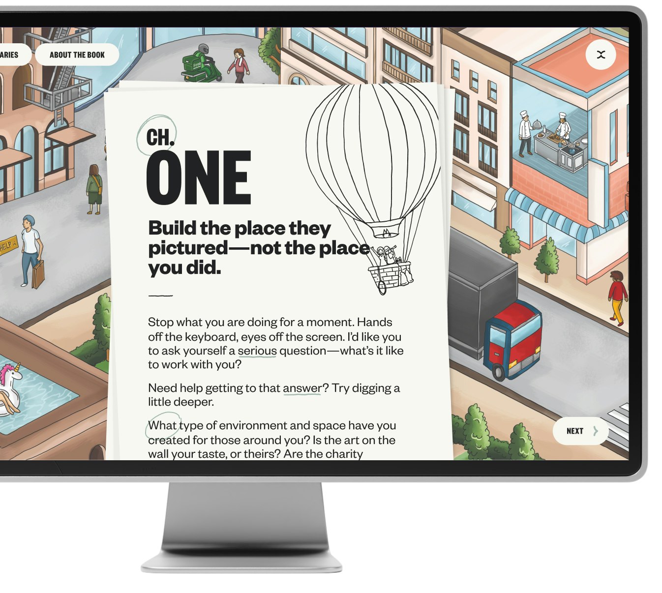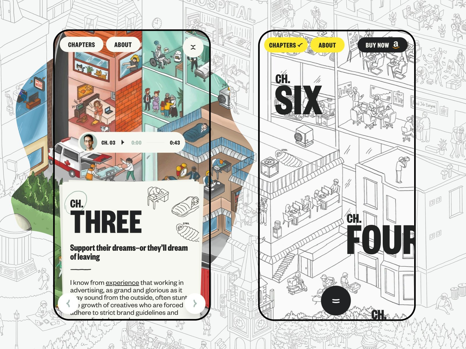 Interact with chapters to fill the line art with color and get rewarded with written word and audio snippets from the book. Enjoy some insane masking that takes place as you navigate from chapter to chapter. This experience works great without sound, but there are so many audible layers added that will put a smile on your face, including snippets from every chapter, peppy background music, and even some wacky interaction-based sounds.