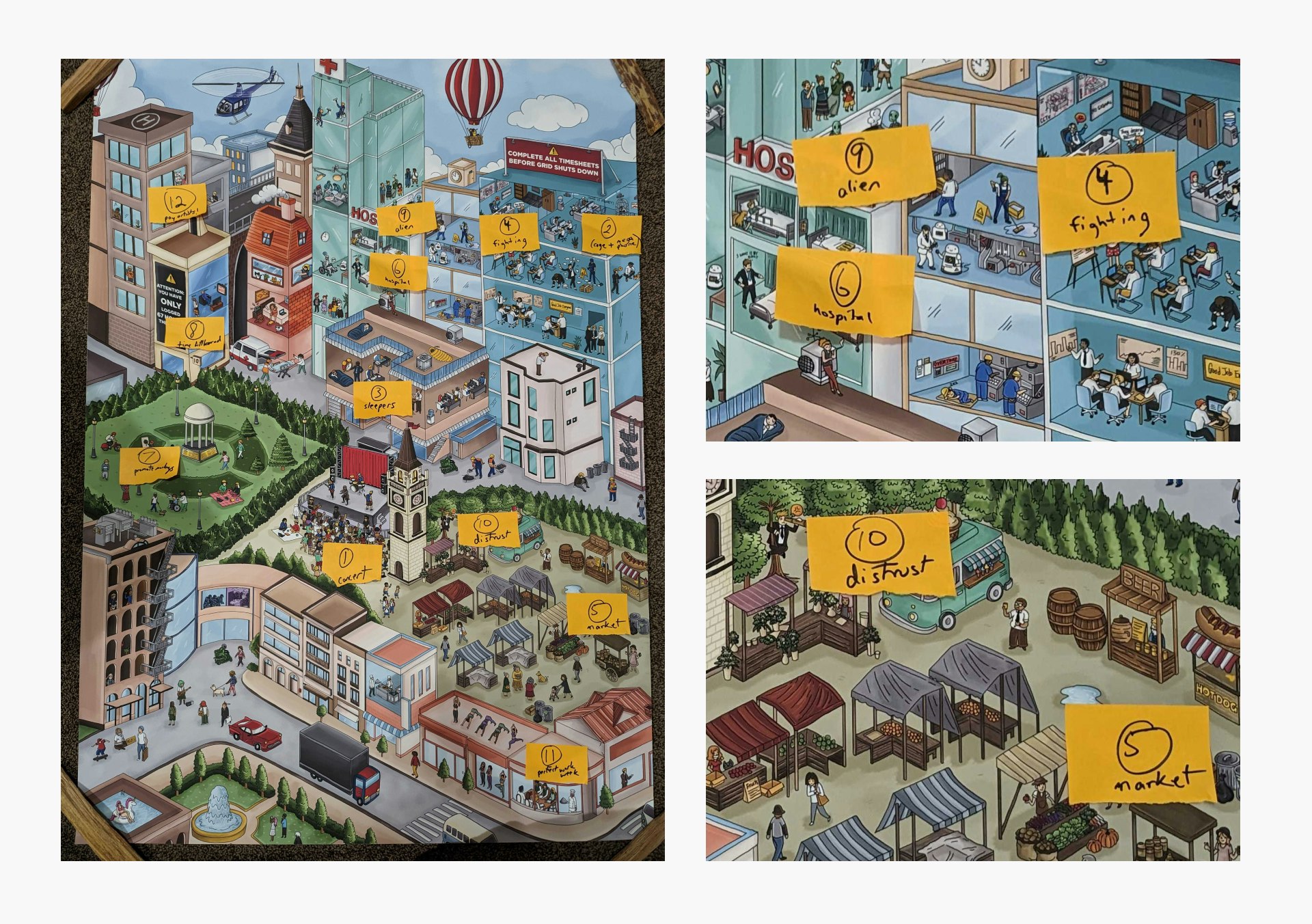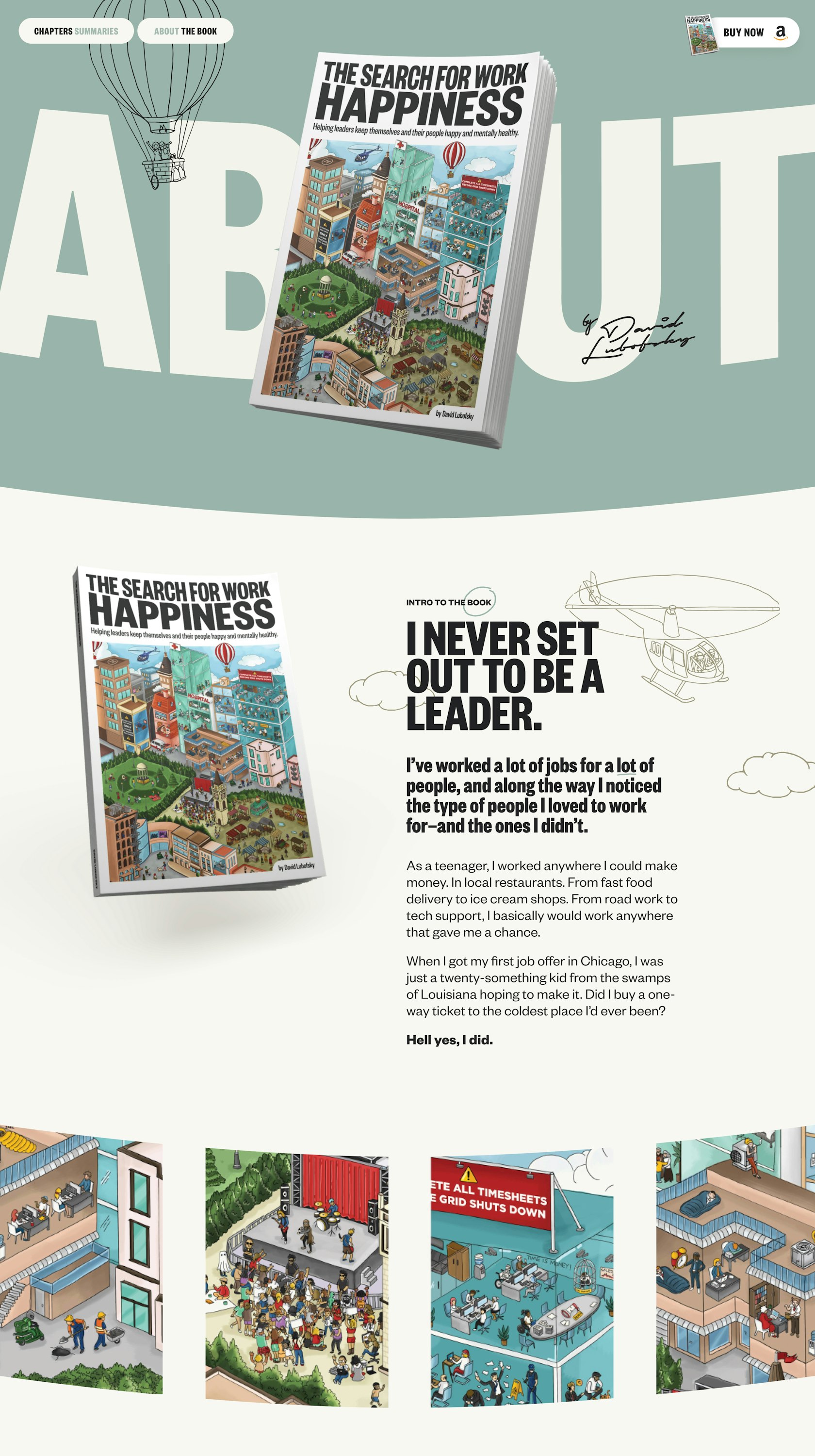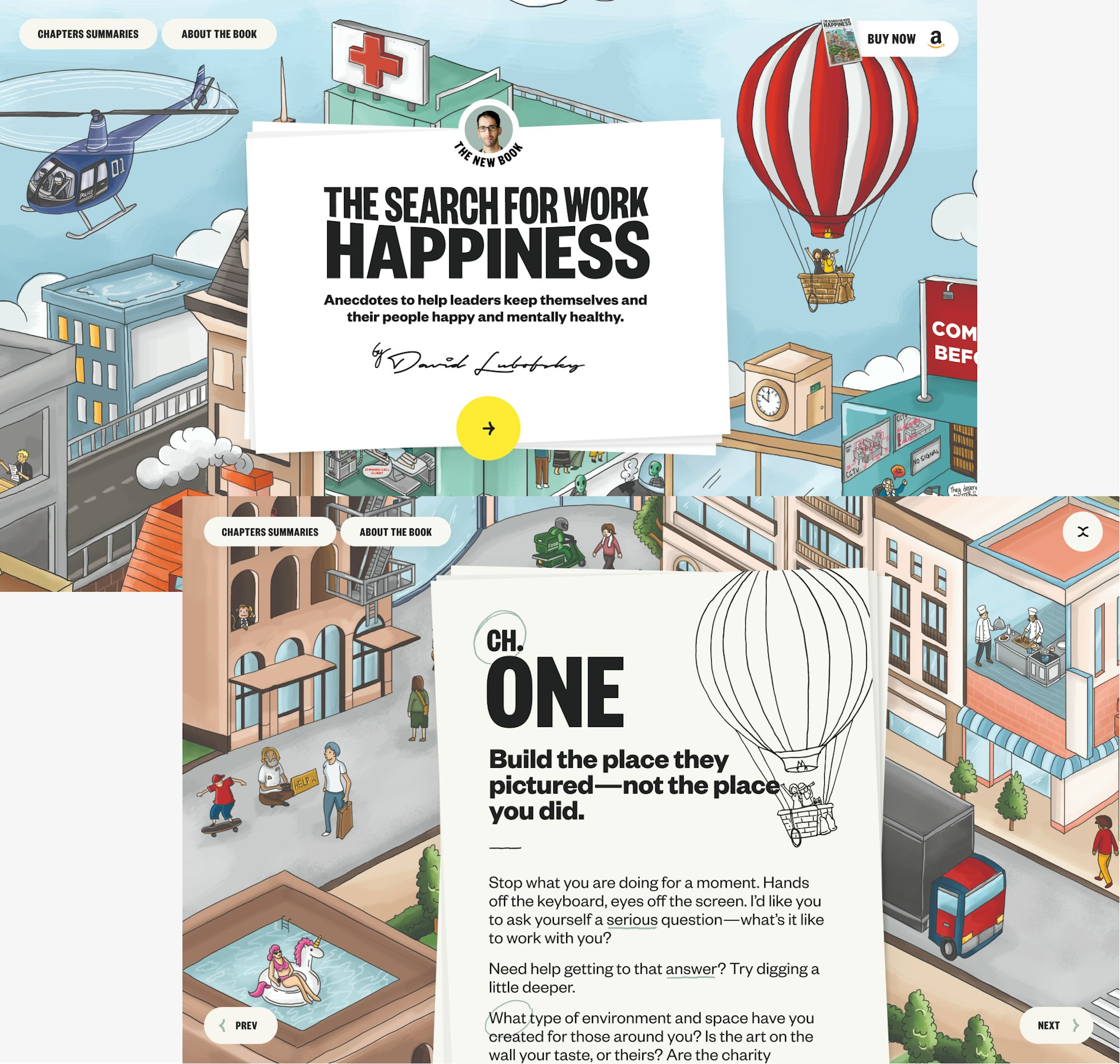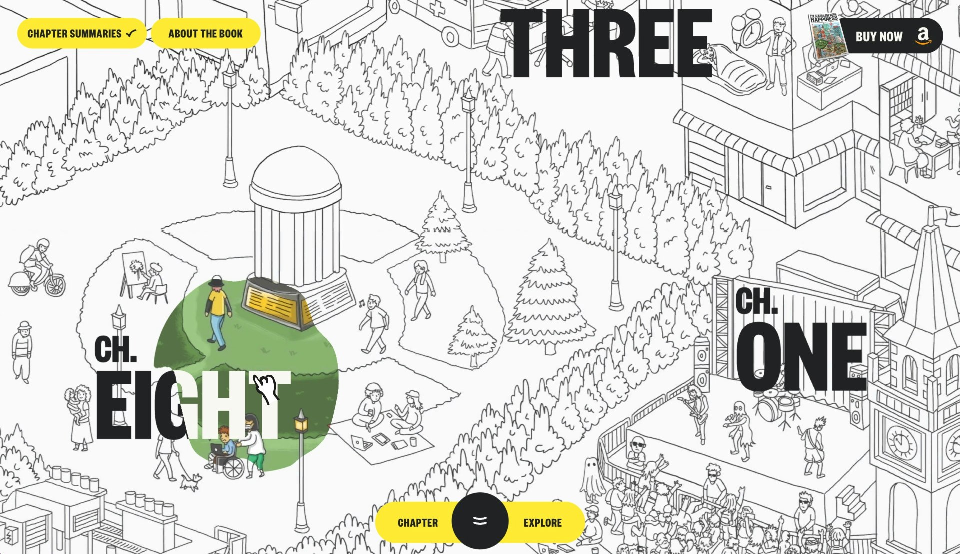 Drag around a Wimmelbilderbuch-style illustrative environment to breathe color and life into this online version of a physical book, which playfully places you at the center of a "search" for work happiness.