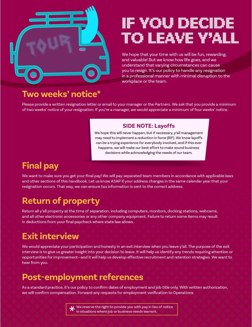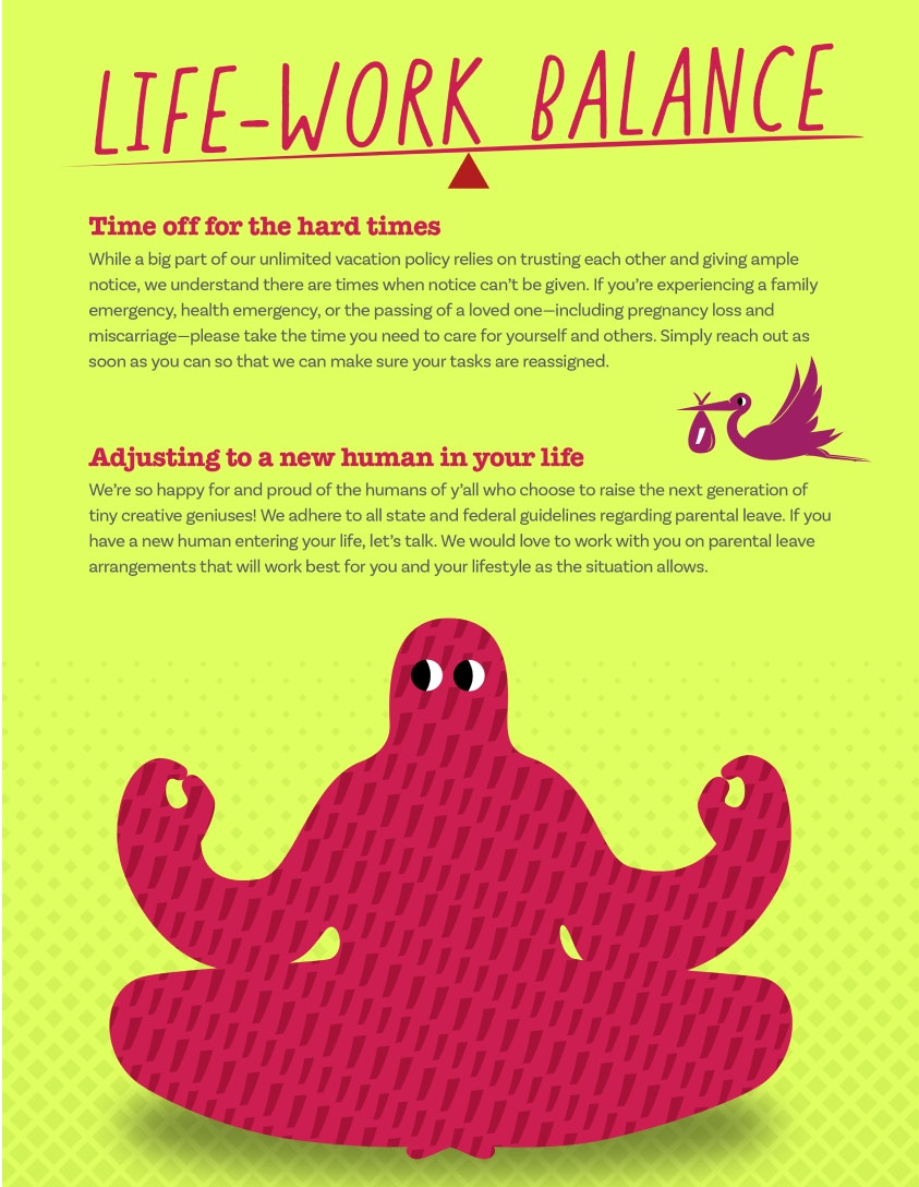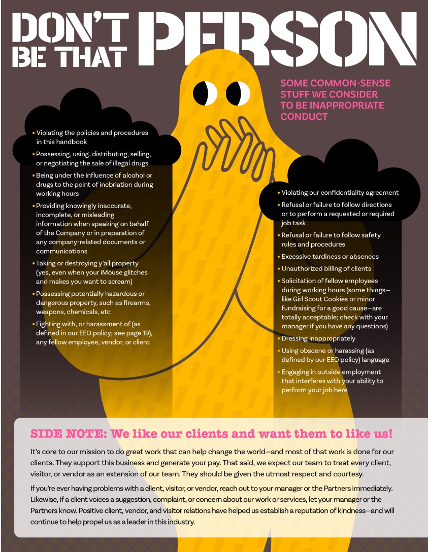 We set a foundation of fun with an anti-boring employee manual that delivered policies like "no tracking time, just do good work"—trust at its purest form.